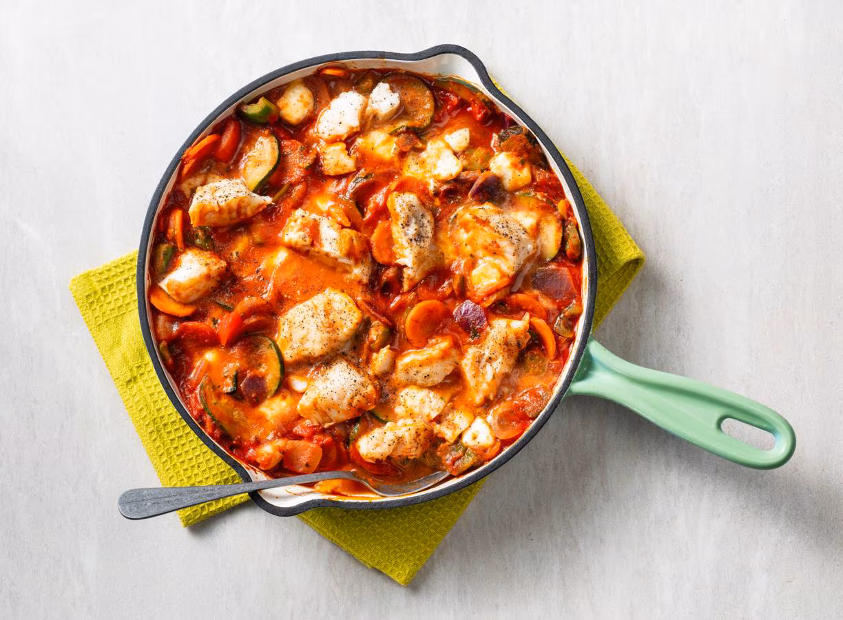 - Voeg de gehalveerde cherrytomaten en de visbouillon toe. Dek af met wat aluminiumfolie en zet de schaal in de oven. Laat het stoofpotje 15-20 minuten garen, of tot de vis gemakkelijk uit elkaar valt en de groenten goed gaar zijn.